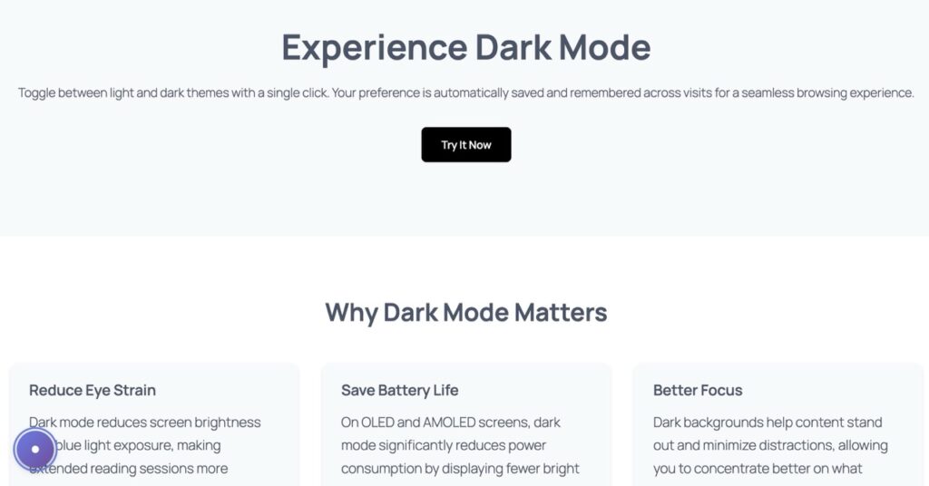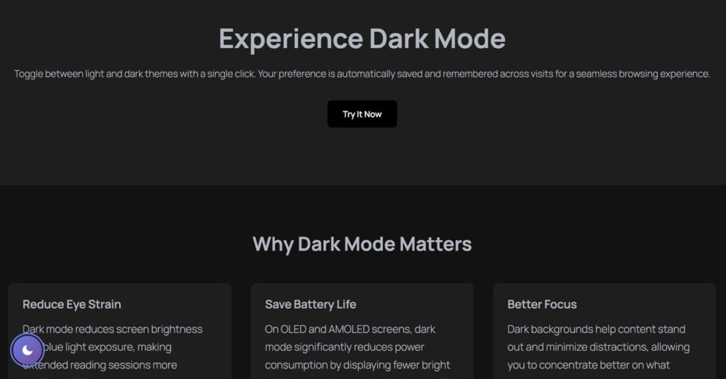Dark mode isn’t just aesthetic—it’s an accessibility feature. Users with photophobia, migraines, or light sensitivity rely on dark themes to browse comfortably. By offering a toggle, you respect diverse needs without forcing a single theme on everyone.