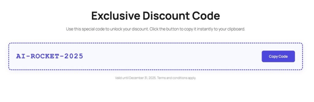 “Generate a Coupon Code block. On the left, display the code ‘AI-ROCKET-2025’. On the right, a button ‘Copy Code’. Use JavaScript so that when clicked, the code is copied to the clipboard, the button text changes to ‘Copied!’, and a small green success checkmark appears. Style it with a dashed border.”