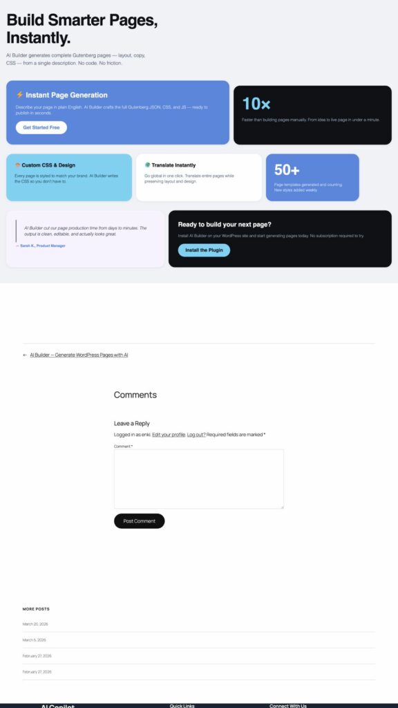 Ejemplos concretos de páginas creadas con AI Builder, junto con los prompts utilizados para generarlas.
