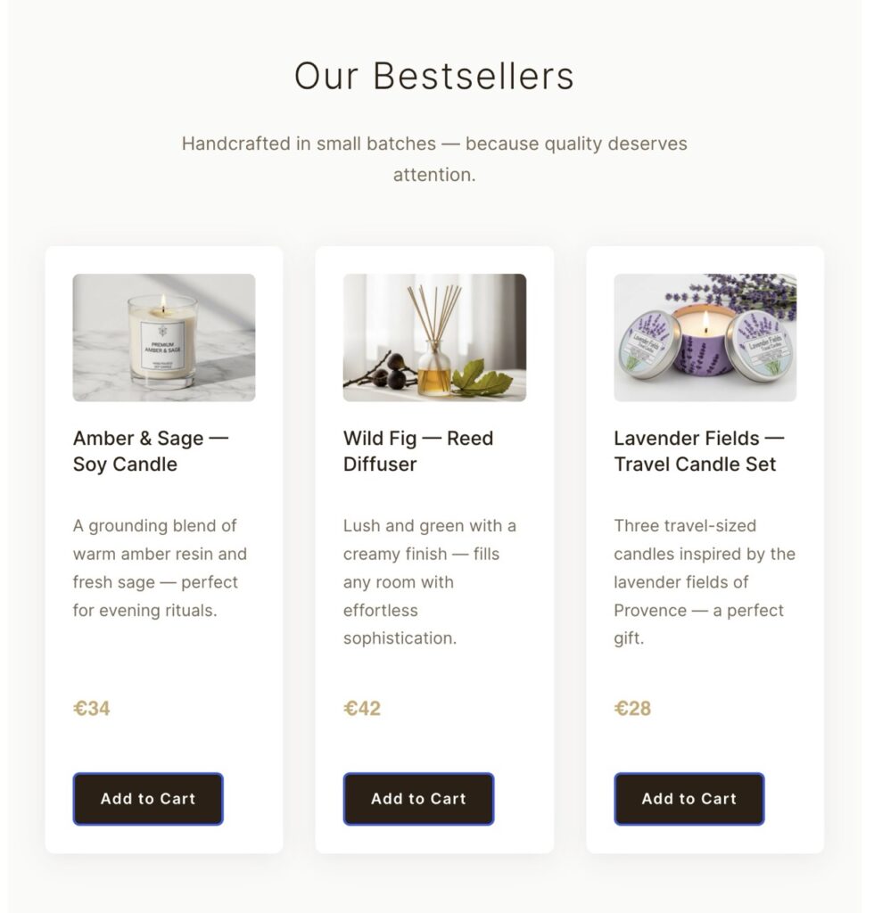 The hero section featured a full-width cover block with a warm gradient overlay, a bold serif headline, and a prominent “Shop Now” CTA button. The product grid used a responsive columns layout with hover effects. The brand story section used a media-text block with generous padding and a subtle background color. Every section felt intentional and cohesive — exactly the kind of result that would typically require hours of manual design work.
